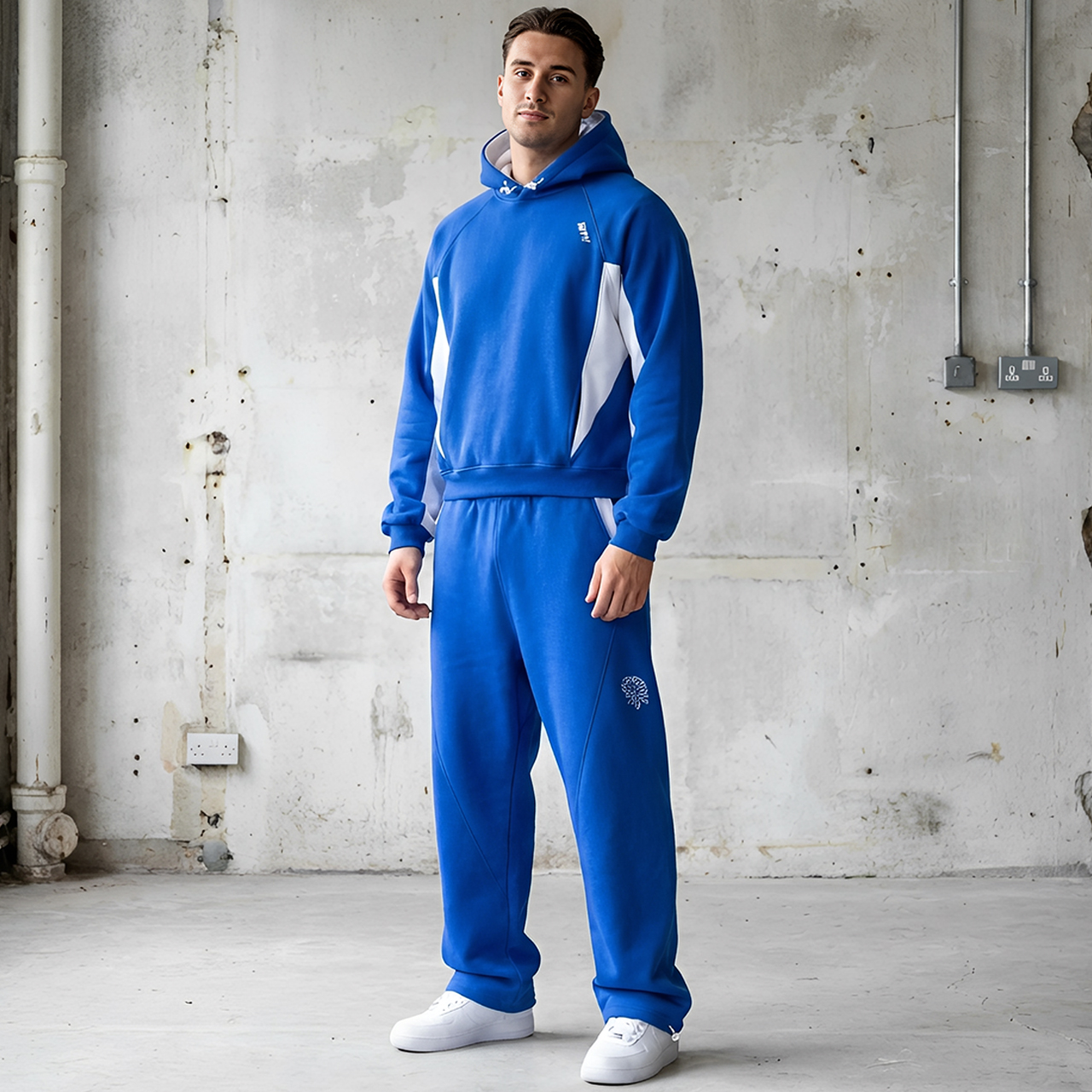 Cet ensemble associe un hoodie à manches longues au design travaillé à un pantalon droit à coupe large, pour un équilibre entre structure et liberté de mouvement. Les empiècements contrastés créent un jeu de lignes dynamique.